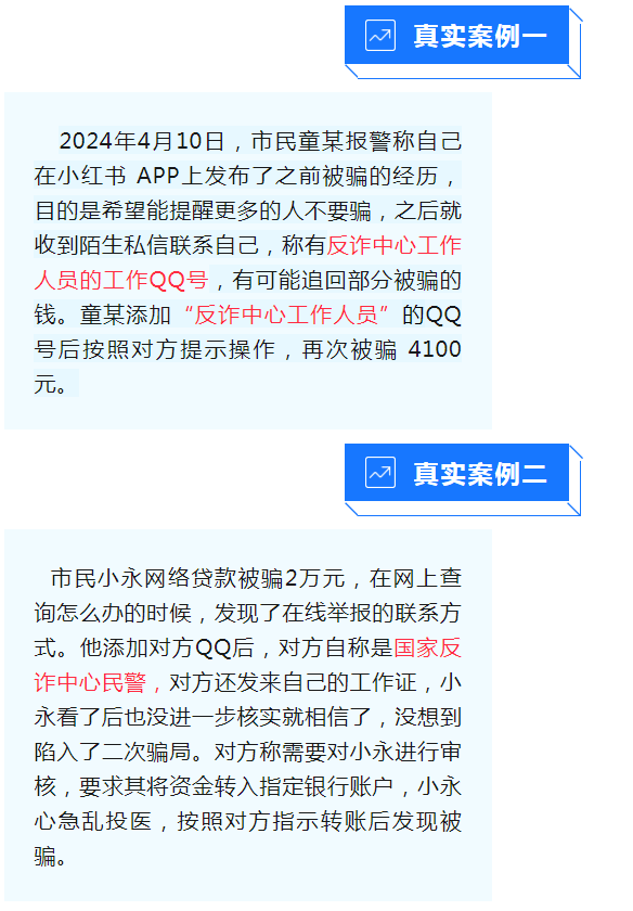 受害人在QQ、網(wǎng)上搜索“反詐中心”“在線報警”,騙子會假模假樣地指導(dǎo)受害人提供證據(jù)材料,再提出讓受害人向指定賬戶轉(zhuǎn)賬,最后導(dǎo)致受害人二次陷入騙局。