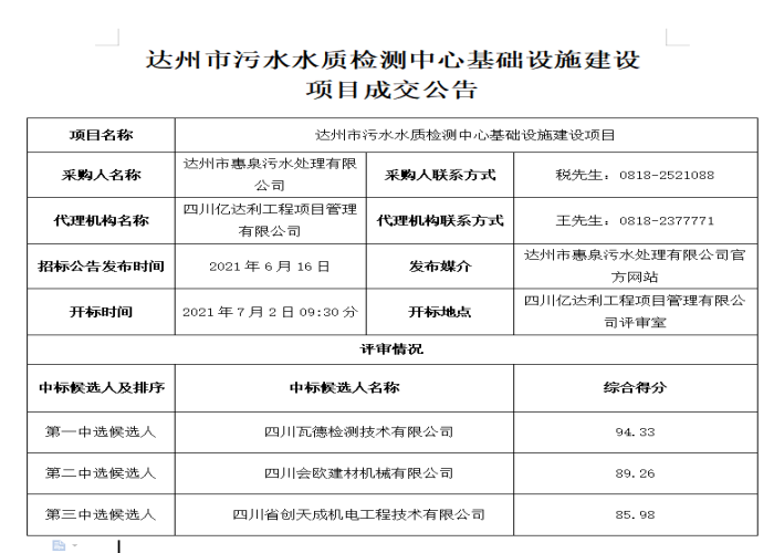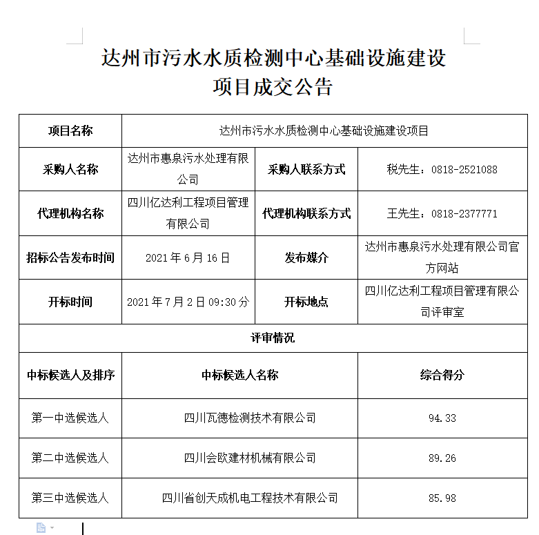 標題:達州市污水水質(zhì)檢測中心基礎設施建設項目成交公告